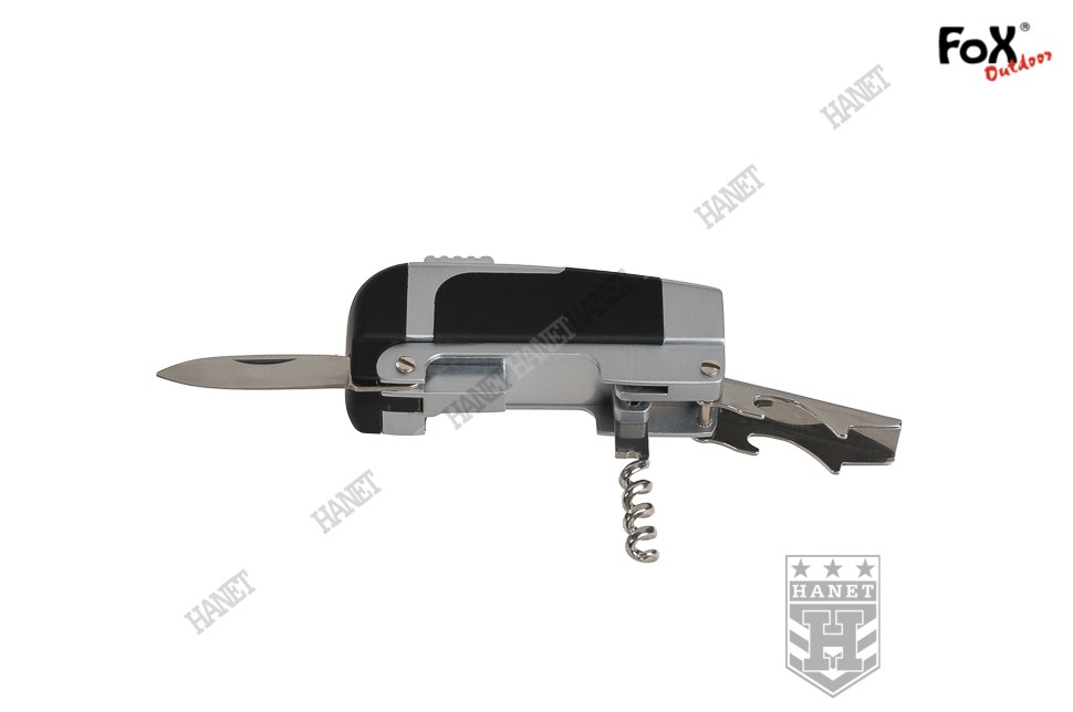 Zestaw dodatkowych narzędzi, przydatnych w wielu sytuacjach. Narzędzia składane, wykonane ze stali nierdzewnej. Ostry nożyk z ostrzem gładkim. Otwieracz do butelek z funkcją dużego śrubokręta płaskiego i przyrządu do podważania. Korkociąg niezbędny do otwierania wina, może służyć jako awaryjne narzędzie do wiercenia w drewnie. Możliwość mocowania sznurków i smyczy.