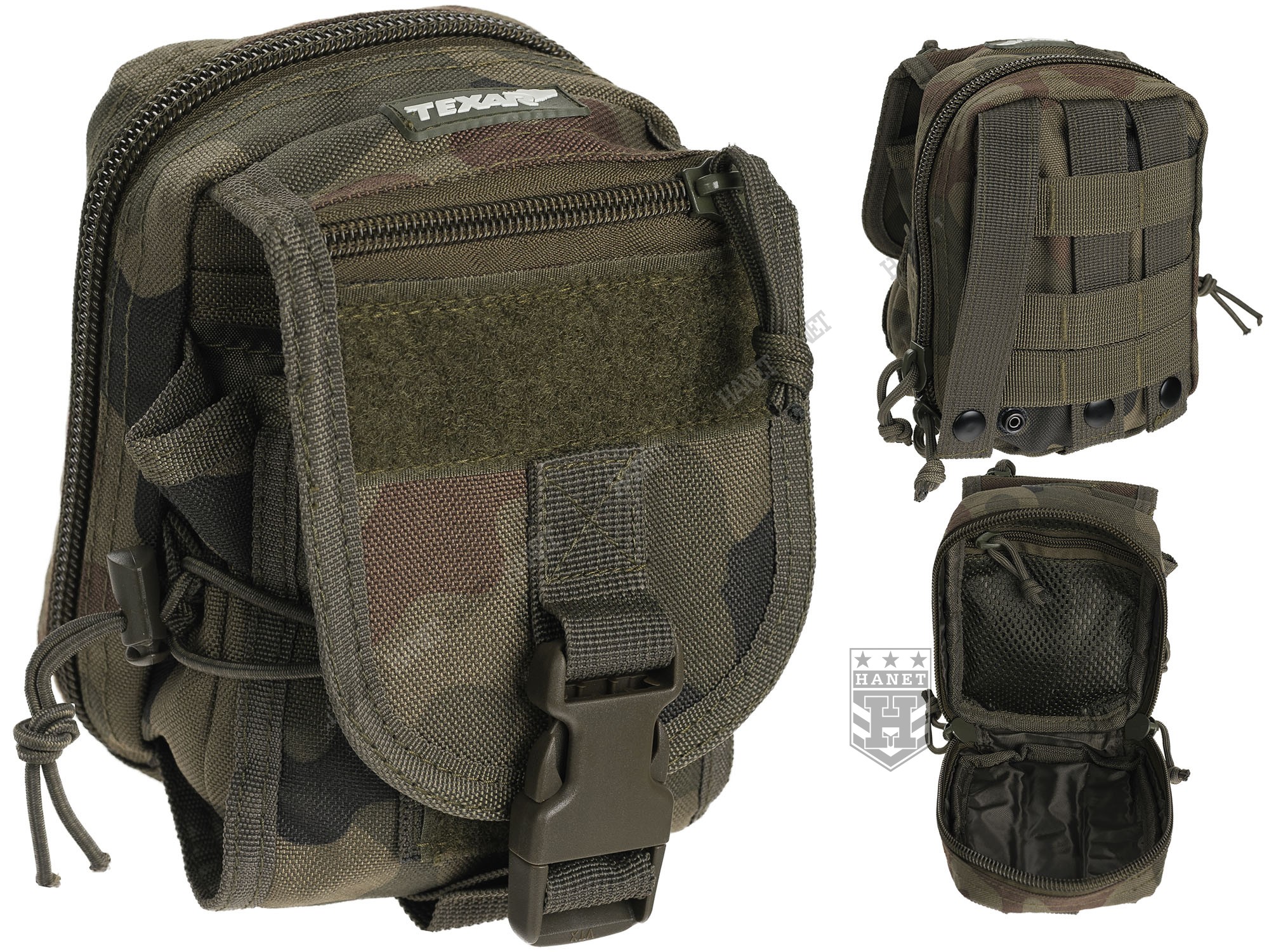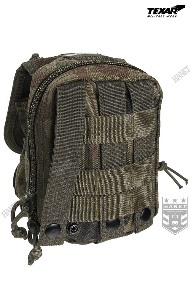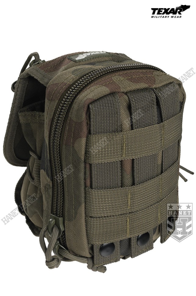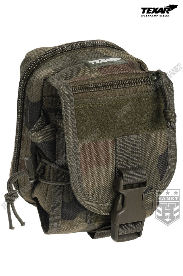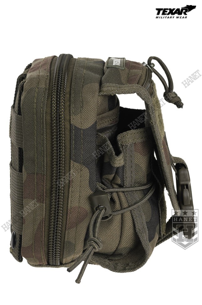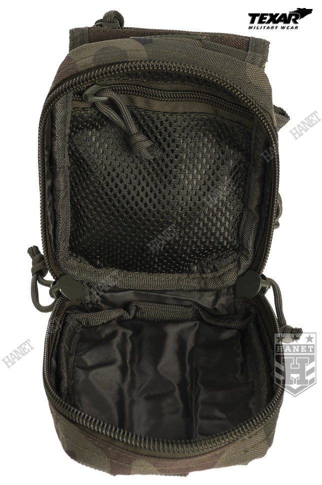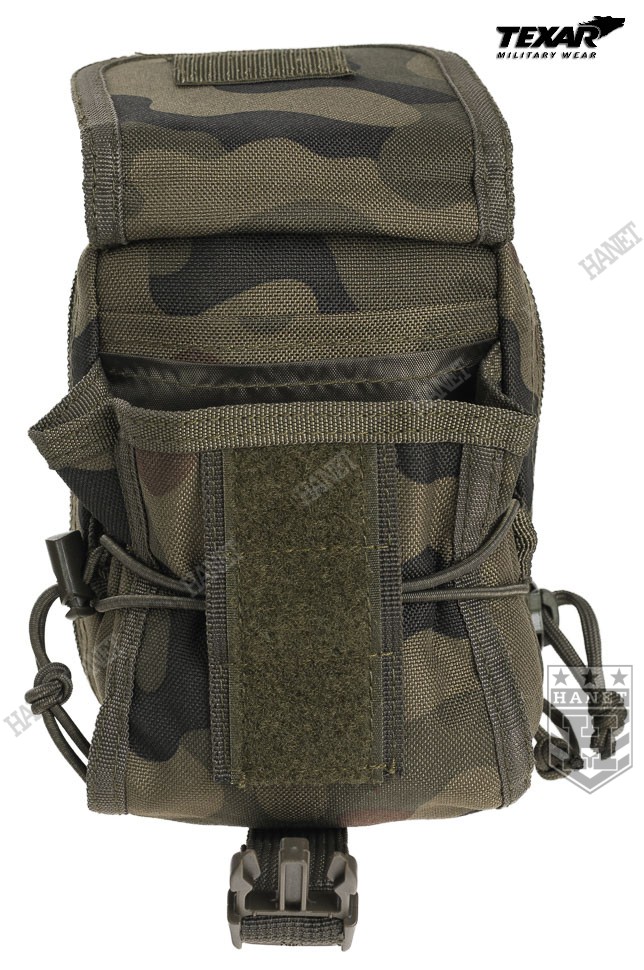 Kieszeń wielozadaniowa w systemie montażowym MOLLE 25 mm. Integralna część oporządzenia taktycznego montowana zazwyczaj do kamizelki operacyjnej, panelu udowego lub plecaka. Polecana profesjonalistom — doceniona przez kontyngenty na bliskim wschodzie. Doskonała do bezpiecznego przechowywania i organizacji drobnego ekwipunku, do którego musimy mieć łatwy dostęp. Przystosowana do specyfiki pracy dowódców drużyn i patroli. Wyposażona w kieszenie na GPS, telefon, iPod'a lub aparat. Idealna do przedmiotów podręcznych jak np. rękawiczki, kominiarka, nóż, multitool, latarka, klucze, stopery itd. Znajdzie szerokie zastosowanie jako np. portfel, apteczka osobista, zasobnik survivalowy, kieszeń na małą rację żywnościową lub radiotelefon z zapasową baterią i akcesoriami. System kieszeni i przegród do organizacji umieszczonych w zasobniku przedmiotów — każdy element wyposażenia znajdzie nim swoje miejsce. Całość wykonana z mocnego wodoodpornego poliestru 1000D, grube szycia gwarantują długowieczność użytkowania. Główna kieszeń zamykana na dwukierunkowy ekspres. Wewnątrz kieszeń z siatki zamykana na zamek. Od frontu naszyta kieszeń z regulacją wysokości i pojemności, zamykana na regulowaną taśmę z klamrą — idealna na radiotelefon lub GPS z antenką. Trzy przegrody pozwalają aranżować przestrzeń dowolnie. Odpinane taśmy montażowe zostały usztywnione, dzięki czemu zasobnik pewnie się trzyma. Solidne nierdzewne napy. Krawędzie obszyte lamówką, dodatkowe taśmy montażowe 25 mm. Na froncie zasobnika znajduje się mała kieszonka płaska z naszytym rzepem.