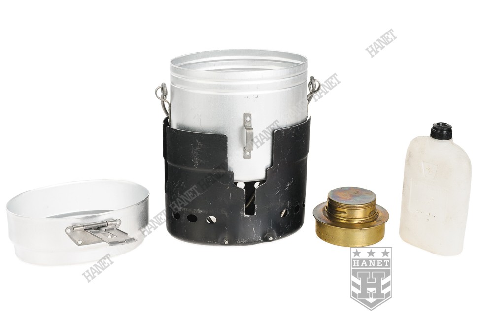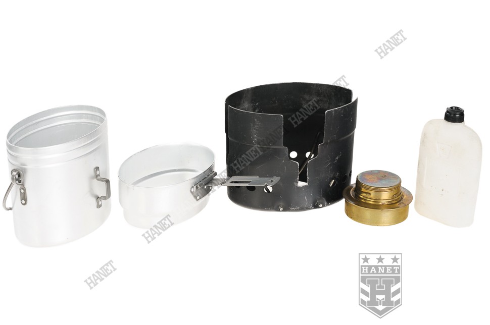 - menażka, kocher spirytusowy, osłona z rusztem i butelka na alkohol