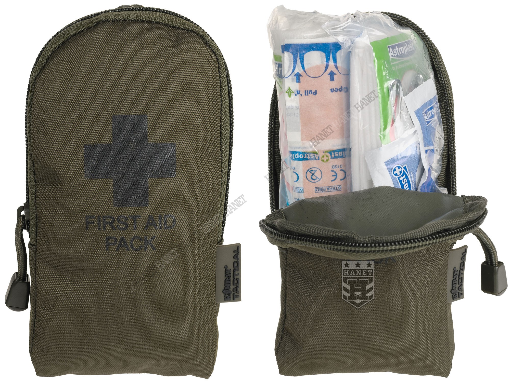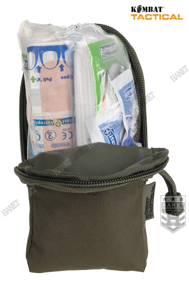 Apteczka indywidualna, zestaw pierwszej pomocy. Przeznaczona dla ludzi aktywnie spędzających czas, sportowców, amatorów turystyki pieszej, nart i nordic walkingu. Bardzo lekka i kompaktowa, zmieści się w kieszeni, torebce rowerowej lub biodrowej. W zestawie znajduję się zestaw opatrunków różnych typów. Apteczka oznakowana czarnym krzyżem. Pokrowiec wykonany z wodoodpornego Tac-Poly 600D, wyposażony w szlufkę do noszenia na pasie. Gumki umożliwiają mocowanie na kijku, kierownicy lub rurce podsiodłowej. Dodatkowym atutem jest haczyk umozliwiający powieszenie apteczki. Zestaw zapakowany w schludny blister.