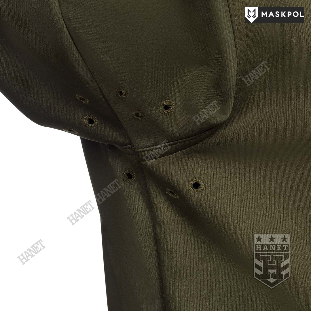Bluza wyposażona w 3 praktyczne kieszenie. Dwie obszerne kieszenie na brzuchu, zamykane zamkami. Duża kieszeń na piersi zamykana na pionowy zamek. Wnętrze wszystkich kieszeni uszyte z gęstej i przewiewnej siatki. Na rękawach naszyto duże panele rzepu do mocowania flag, naszywek morale patch lub formacji. Na lewej piersi znajduje się rzep na imiennik.