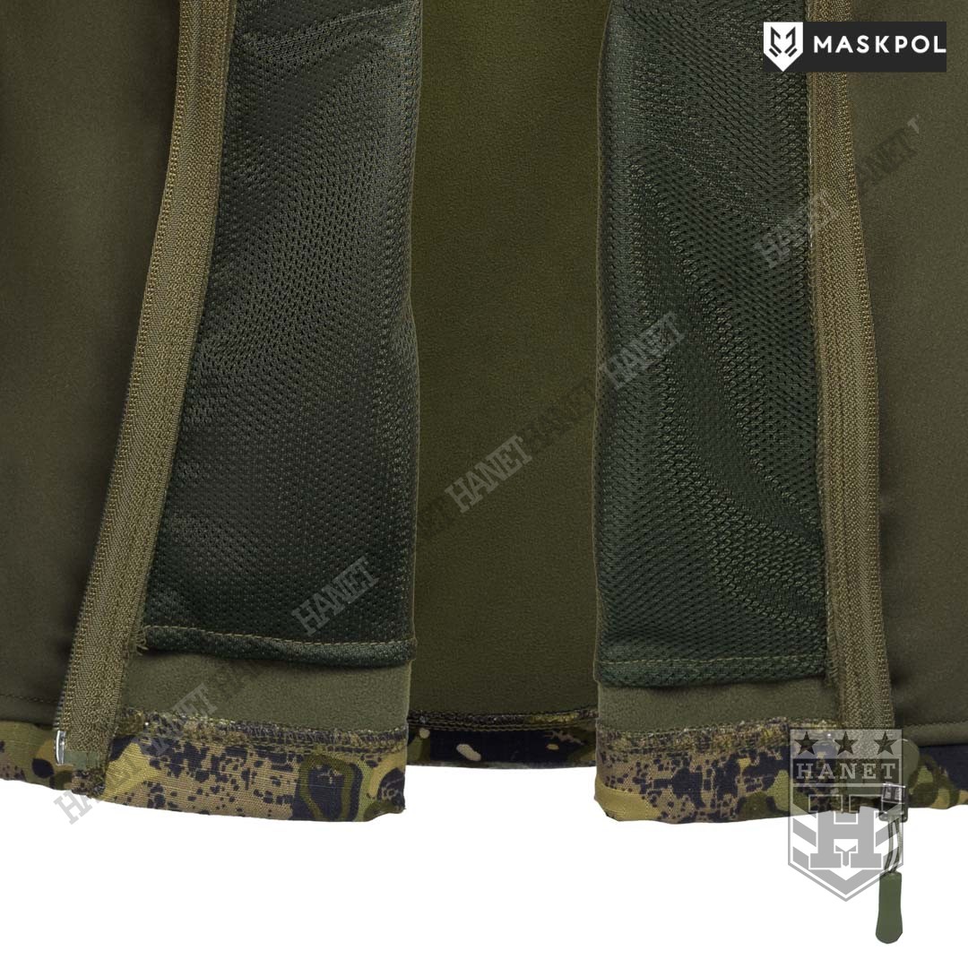 Trójwarstwowy laminat z membraną PTFE (Teflon) zatopioną w środkowej warstwie materiału. Membrana z mikroporami, przez które nie przeciśnie się cząsteczka wody, a jednocześnie na tyle dużymi by przepuszczać cząstki gazowe - pary wodnej i powietrza. Membrana pozwala skórze swobodnie oddychać i odprowadzać wilgoć na zewnątrz. Dodatkowym zabezpieczeniem przed przemoczeniem jest technologia hydrofobowa WDP. Dzięki zastosowanej impregnacji woda swobodnie spływa po powierzchni tkaniny. Wierzchnia warstwa materiału wykonana z gęsto tkanych włókien Poliestrowych, które cechuje duża odporność na rozerwanie. Ocieplenie z miękkiego polaru PES (Microfleece). Polar poprawia właściwości termiczne, transportuje wilgoć na zewnątrz i zapewnia lepszą cyrkulację powietrza. Microfleece zachowuje swoje właściwości izolacyjne nawet po przemoczeniu, jest szybkoschnący, antybakteryjny i miły w dotyku. Łokcie i barki wzmocnione dodatkową warstwą materiału w kamuflażu MAPA. Solidne gęste szwy, wielokrotne przeszycia w newralgicznych miejscach. Płaskie szwy nie uwierają, wzmocnienia krawędzi ściegiem Overlock.