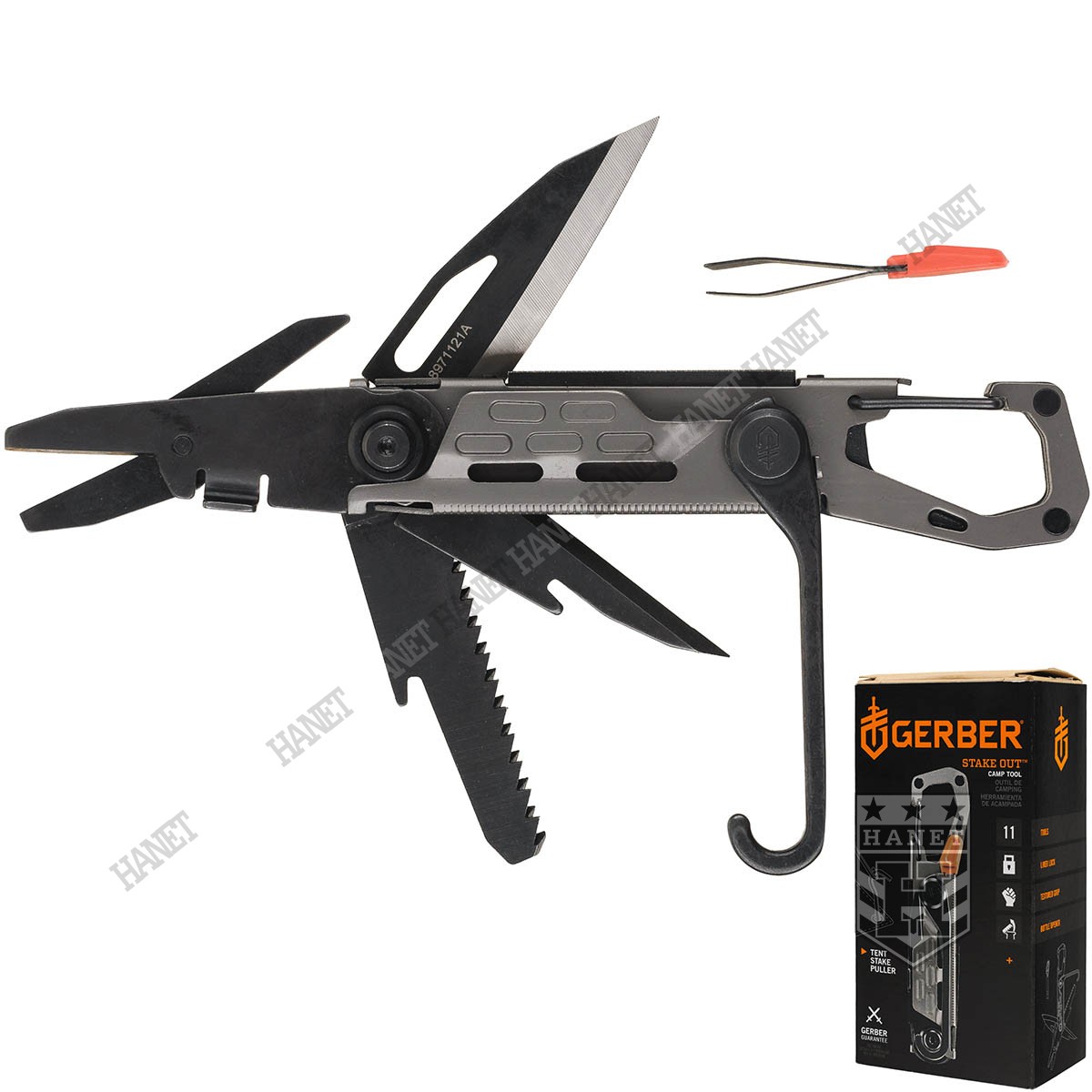 Dodatkowe narzędzia okażą się pomocne wielu sytuacjach. Karabinek z automatycznym zamkiem pozwala na zaczepienie multitoola na szlufce spodni, pasku plecaka lub systemie modularnym. Zawieszenie toola gwarantuje, że narzędzie jest zawsze pod ręką. Karabinek umożliwia przyczepienie kluczy, krzesiwa, gwizdka pełniąc rolę breloka. Karabinek pełni jednocześnie funkcję otwieracza do kapsli. Pęseta chowana w rękojeści, niezastąpiona do wyciągania kleszczy, umożliwia chwytanie drobnych przedmiotów lub nawlekanie igły. Pęseta posiada plastikowy element w kolorze czerwonym, który ułatwia znalezienie pęsety gdyby upadła w trawę. Miarka centymetrowa i calowa pomoże w ocenie odległości na mapie i pozwoli zmierzyć różne przedmioty.