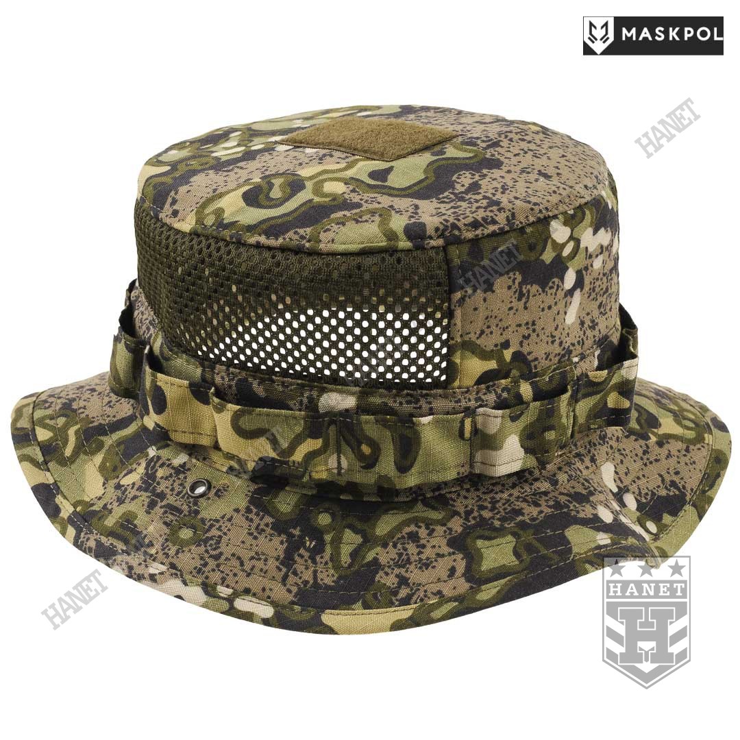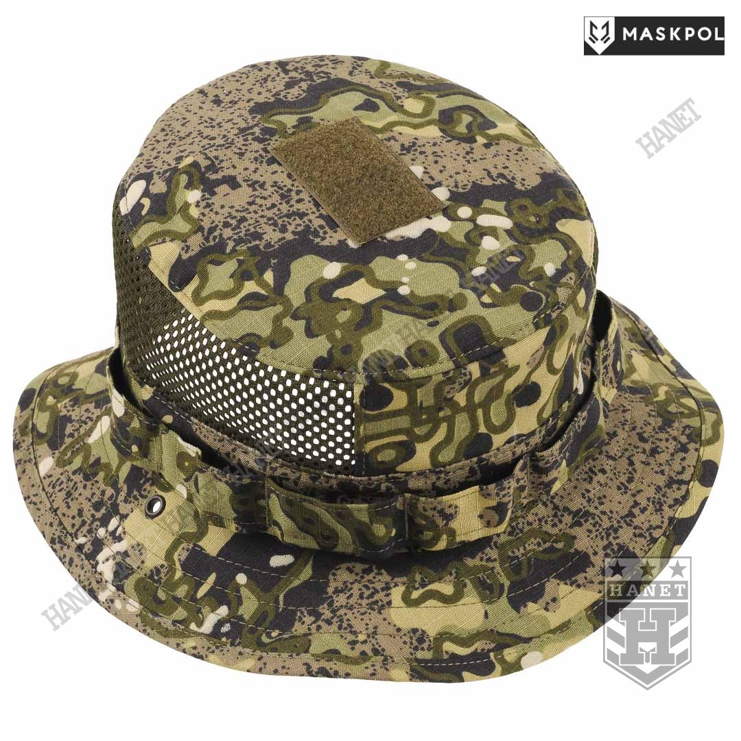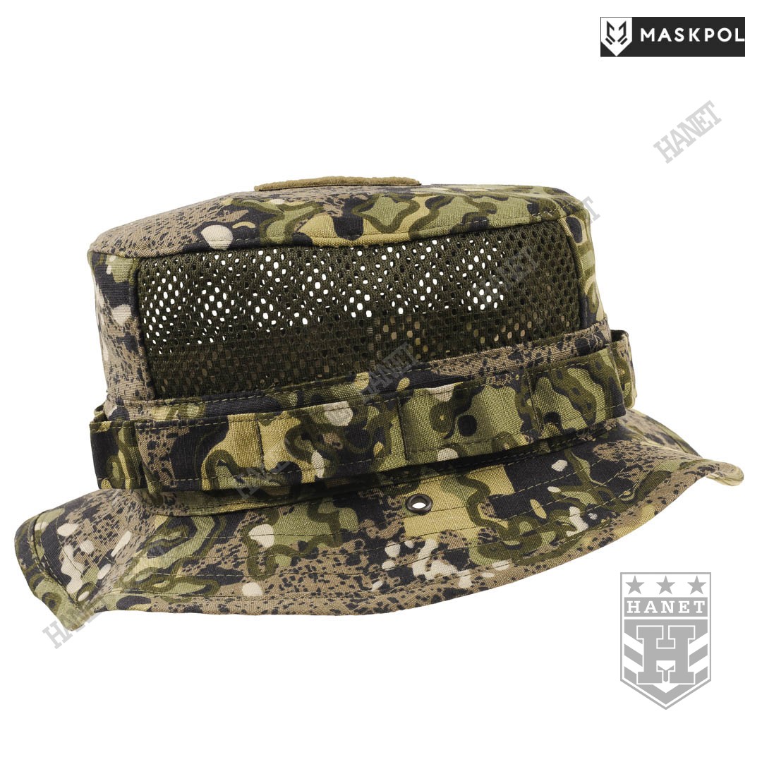 Nowoczesny kapelusz letni z obszernymi wywietrznikami siatkowymi. Solidna i gruba siatka MESH spełnia funkcję maskującą z zachowaniem dużej przewiewności. Dwa boczne panele z siatki gwarantują dobrą wentylację, zabezpieczają jednocześnie przed owadami. Kapelusz chroni przed palącym słońcem i dobrze maskuje. Rondo średniej wielkości pełni rolę daszka chroniącego oczy, kark i uszy przed słońcem. Rondo zabezpiecza oczy lub okulary przed zalewaniem na deszczu. Rondo usztywniane z zachowaniem pełnej elastyczności, przeszycia zabezpieczają przed rozwarstwieniem materiału. Po bokach nabito metalowe nity – oczka do mocowania sznurka pod brodę. Wokół kapelusza wszyto taśmę uszytą z kilku warstw materiału. Liczne pętle służą do mocowania maskowania lub moskitiery na twarz. Na czubku głowy doszyto rzep na naszywki lub marker świetlny.