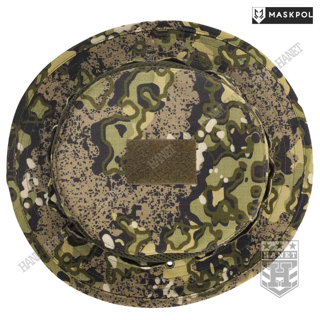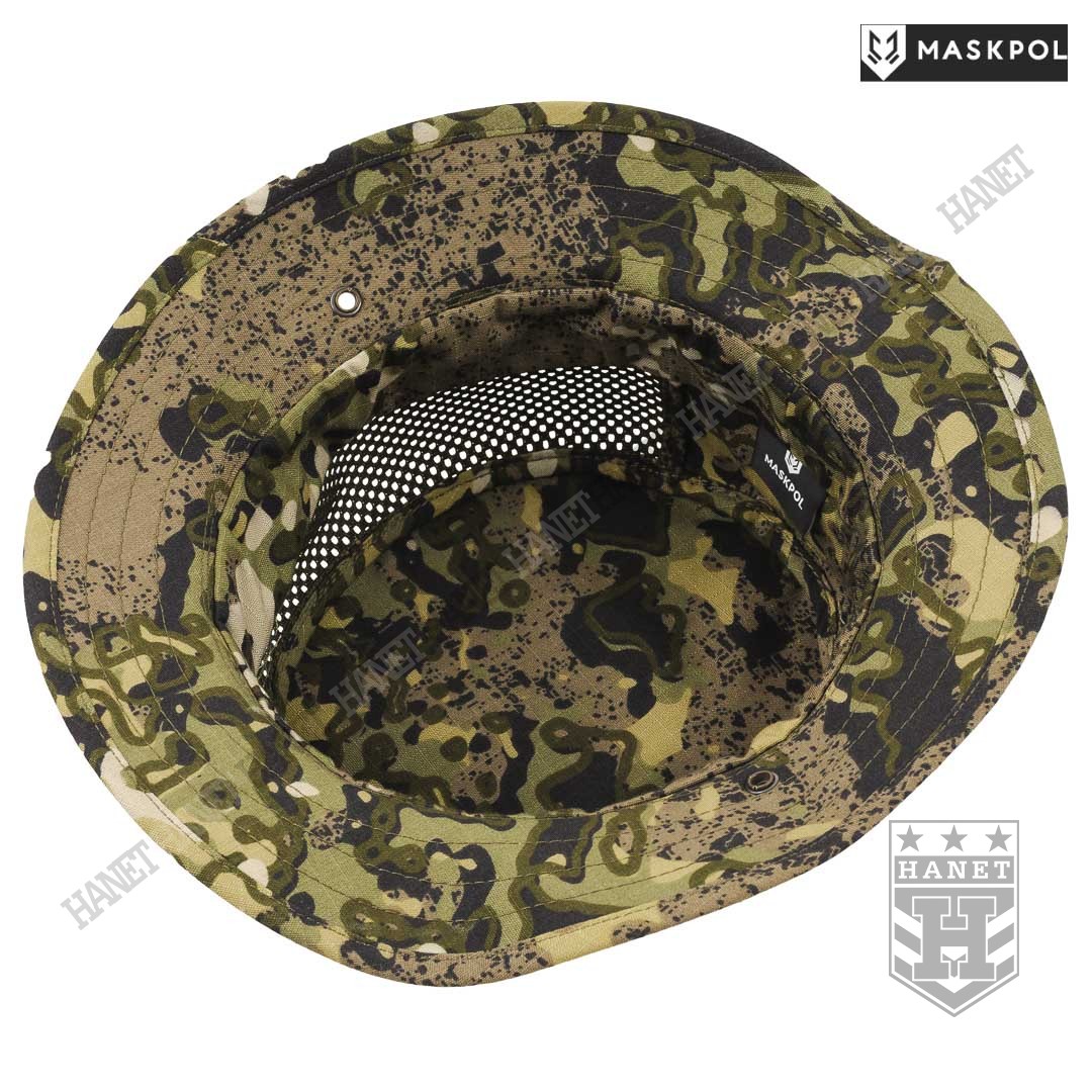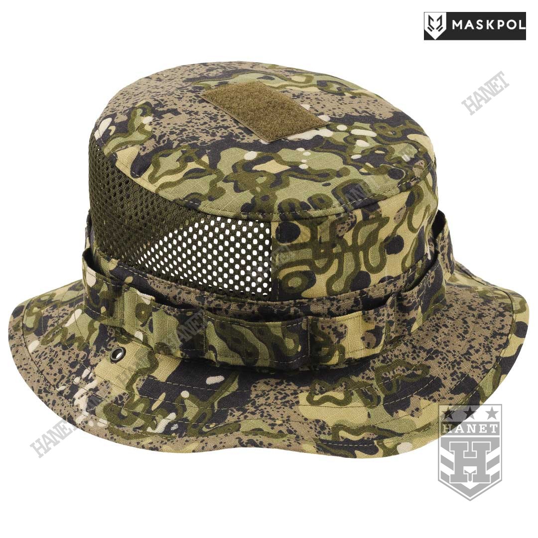 Nowoczesny kapelusz letni z obszernymi wywietrznikami siatkowymi. Solidna i gruba siatka MESH spełnia funkcję maskującą z zachowaniem dużej przewiewności. Dwa boczne panele z siatki gwarantują dobrą wentylację, zabezpieczają jednocześnie przed owadami. Kapelusz chroni przed palącym słońcem i dobrze maskuje. Rondo średniej wielkości pełni rolę daszka chroniącego oczy, kark i uszy przed słońcem. Rondo zabezpiecza oczy lub okulary przed zalewaniem na deszczu. Rondo usztywniane z zachowaniem pełnej elastyczności, przeszycia zabezpieczają przed rozwarstwieniem materiału. Po bokach nabito metalowe nity – oczka do mocowania sznurka pod brodę. Wokół kapelusza wszyto taśmę uszytą z kilku warstw materiału. Liczne pętle służą do mocowania maskowania lub moskitiery na twarz. Na czubku głowy doszyto rzep na naszywki lub marker świetlny.