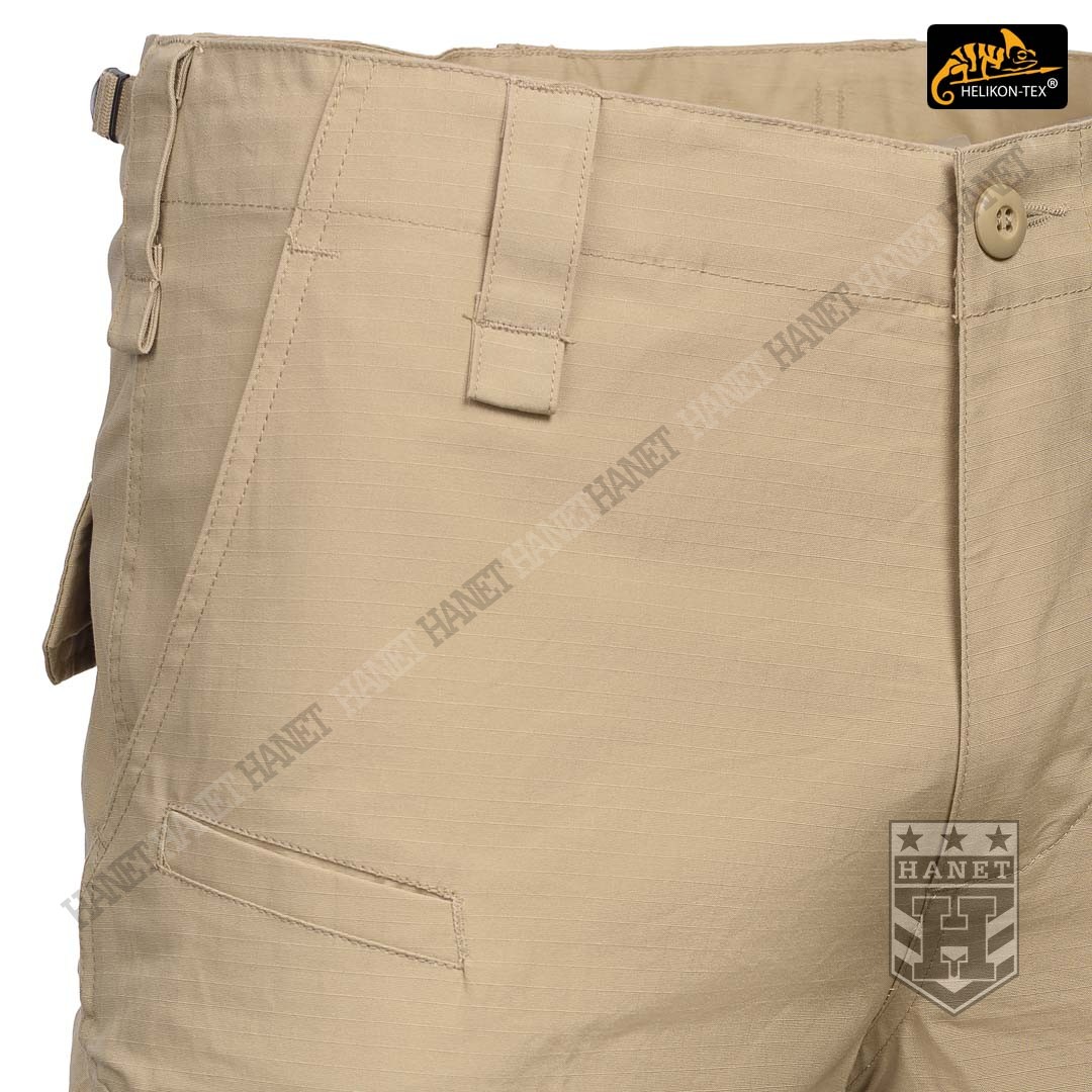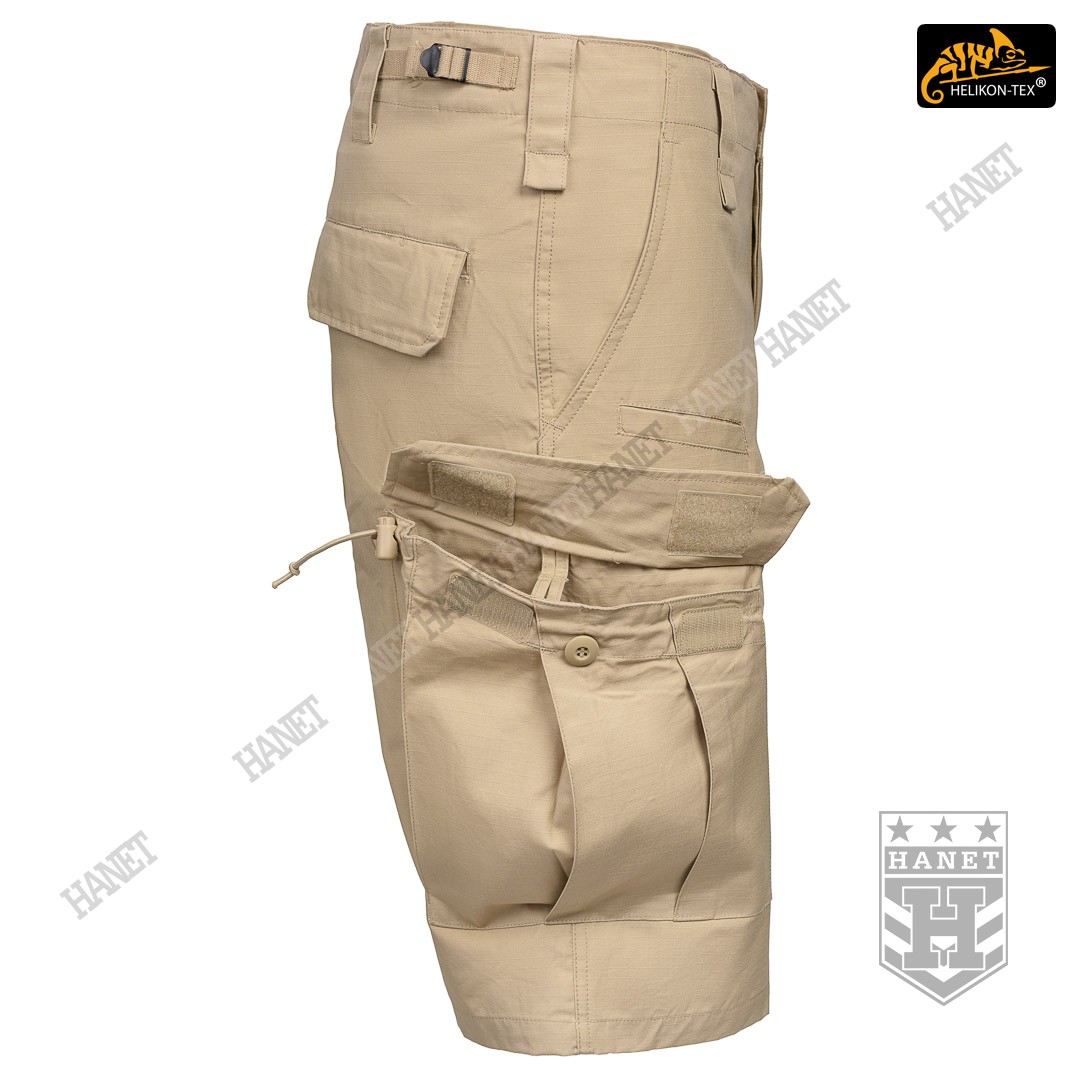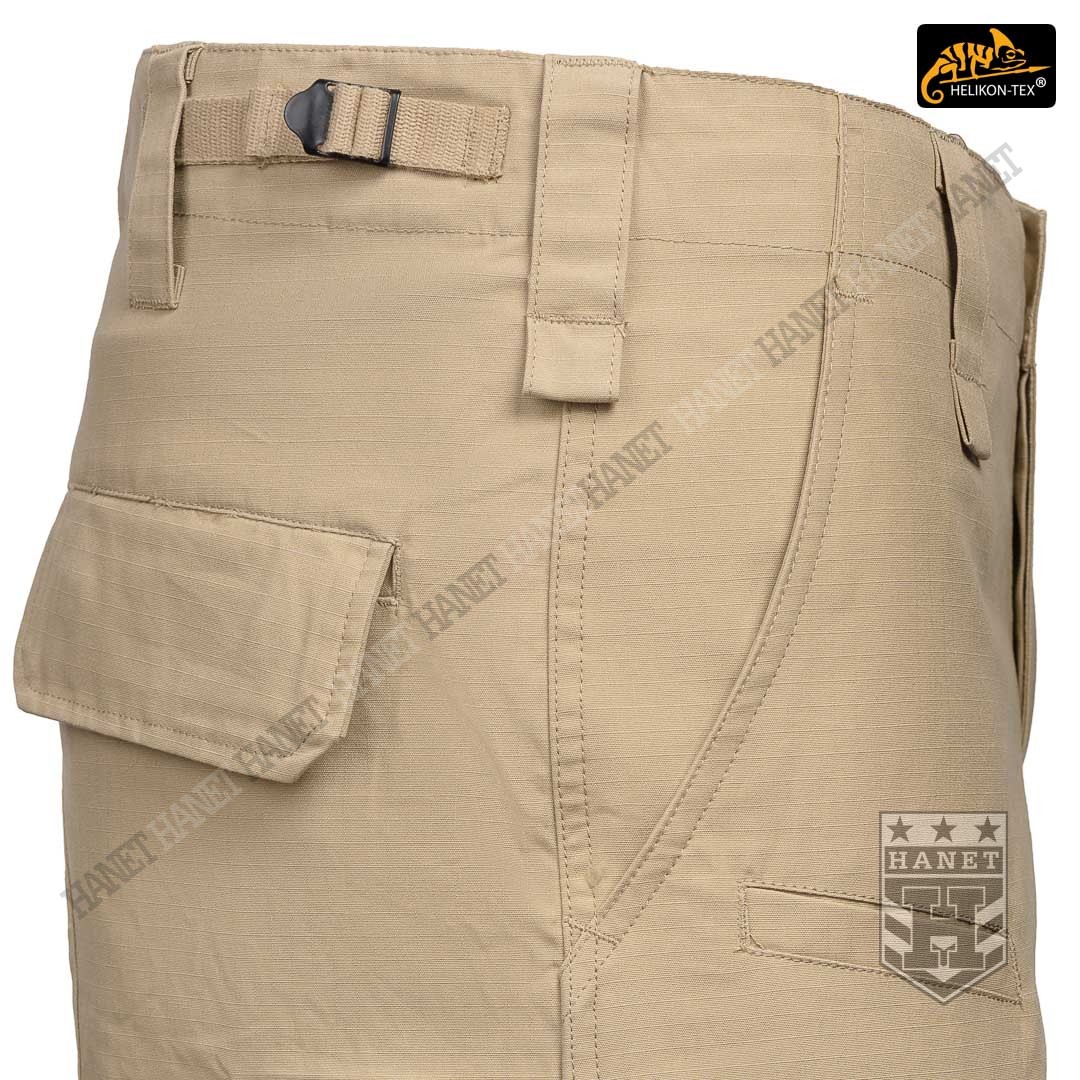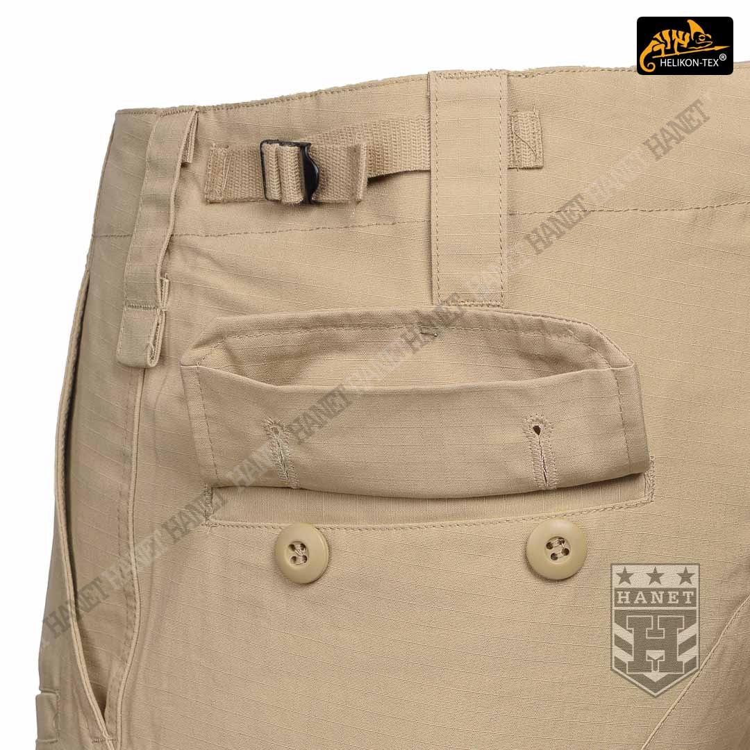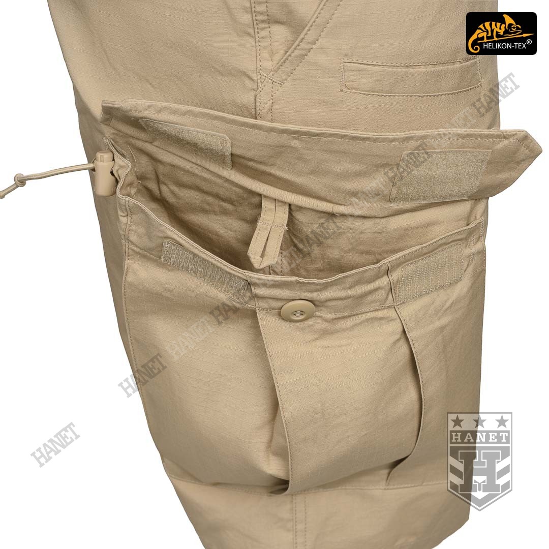 System ośmiu praktycznych kieszeni pozwala przenosić ważne przedmioty zawsze pod ręką. Dwie główne kieszenie typu CARGO naszyte z boku nogawki na udach, przeznaczone na duże przedmioty. Kieszenie posiadają miechy zwiększające ich pojemność i zmniejszające je optycznie gdy nie są wypchane. Kieszenie boczne są zamykane patką z rzepami oraz dodatkowo na centralny guzik. Elastyczny ściągacz ze stoperem zabezpiecza przed zgubieniem drobnych przedmiotów, jednocześnie chroni wnętrze przed piaskiem. Dwie kieszenie tylne zamykane patką na guziki, posiadają wzmocnione wejście. Dwie klasyczne kieszenie na biodrach, głębokie i pojemne. Skośne wejście kieszeni daje łatwy dostęp do wnętrza. Krawędź kieszeni została wzmocniona, dla ochrony przed przecieraniem lub uszkodzeniem od klipsa noża. Dwie płaskie kieszonki umieszczone od frontu, doskonałe na przedmioty, do których musimy mieć szybki dostęp np. nóż, latarkę, lub magazynki pistoletowe lub do karabinka 5,56mm.