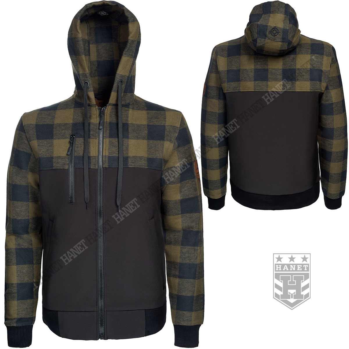 Uszyta z połączenia softshella i grubej flaneli w klasyczną kratę. Górna część tułowia, rękawy i kaptur uszyte z ekstremalnie oddychającej tkaniny flanelowej, co zabezpiecza przed przegrzaniem. Flanela jest gruba i daje dużo ciepła. Tkania techniczna Softshell z ociepleniem z mikropolaru. Softshellchroni przed wiatrem i jednocześnie oddycha. Dzięki impregnacji hydrofobowej DWR (flaneli i softshella) materiał nie nasiąka i jest odporny na plamy. Wielokrotne przeszycia w newralgicznych miejscach dla wzmocnienia.