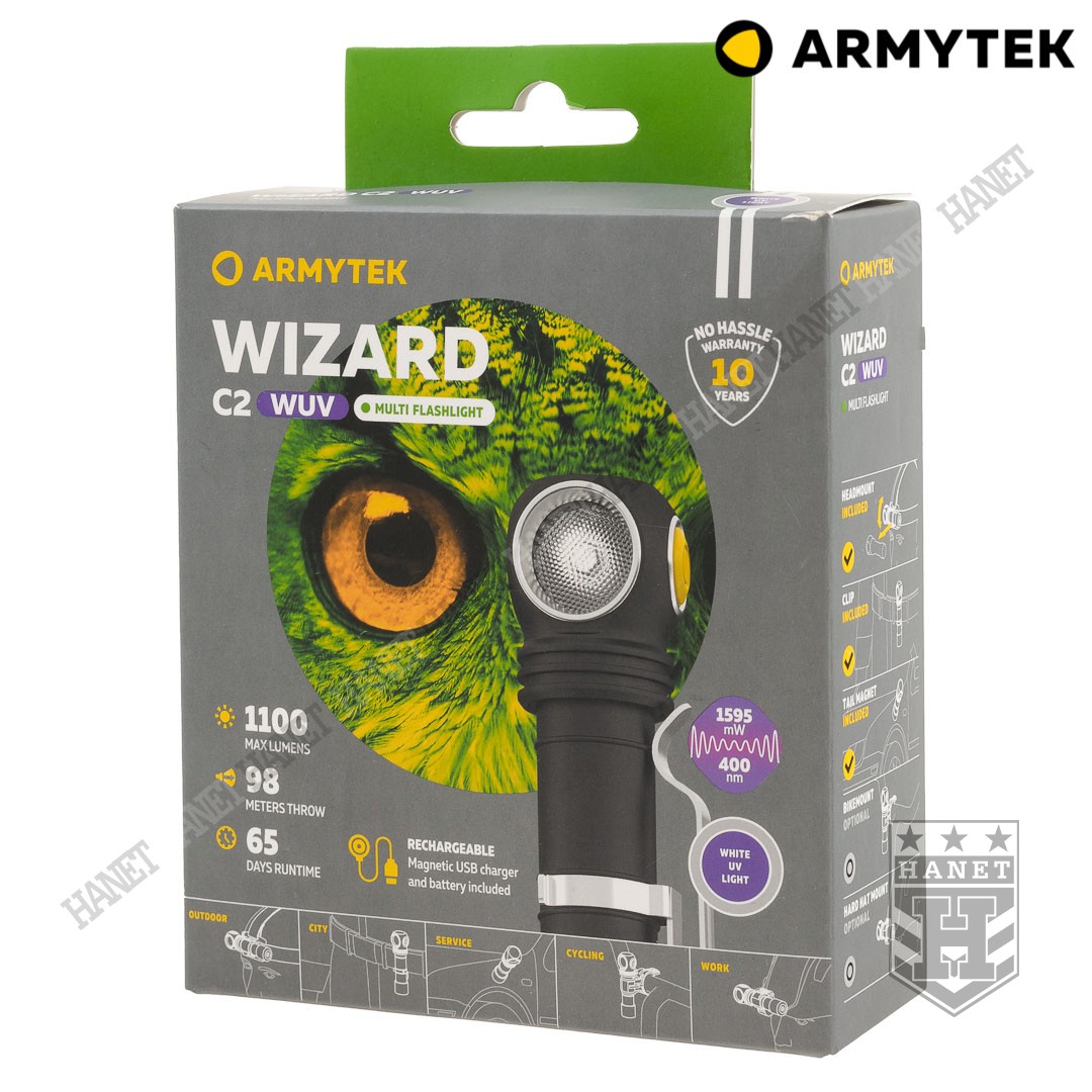Wizard C2 WUV to specjalistyczna latarka wyposażona w 2 diody białe i 2 diody emitujące UV o częstotliwości 400nm. Światło ultrafioletowe jest przydatne podczas weryfikacji autentyczności pieniędzy, papierów wartościowych i dokumentów, w kryminalistyce, w mechanice / przemyśle podczas wykrywania wycieków np. z klimatyzacji, znajdywania plam wydzielin jak np. krew i uryna, w myślistwie szukanie postrzałka, znajdowanie minerałów (np. bursztyn).