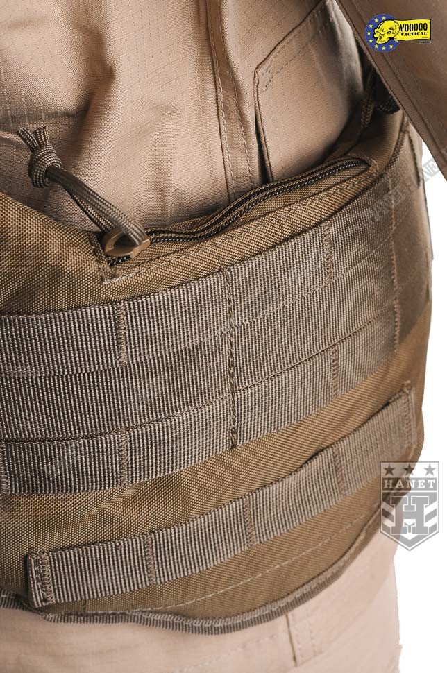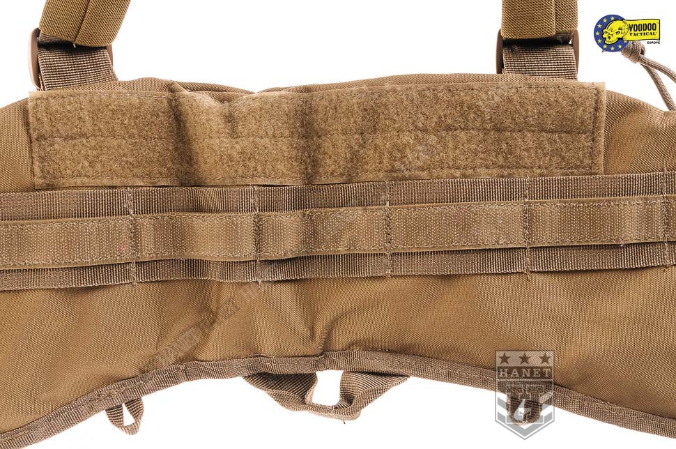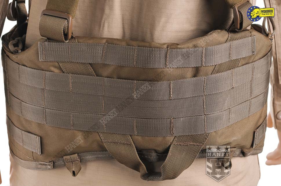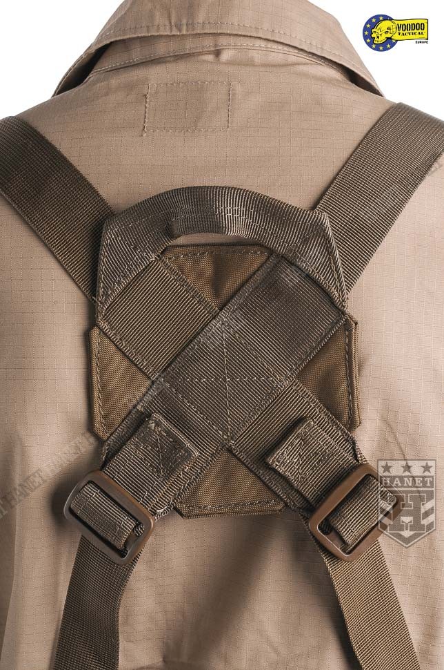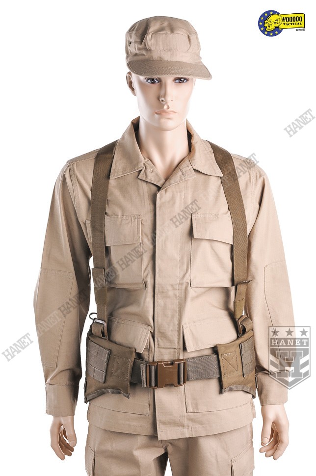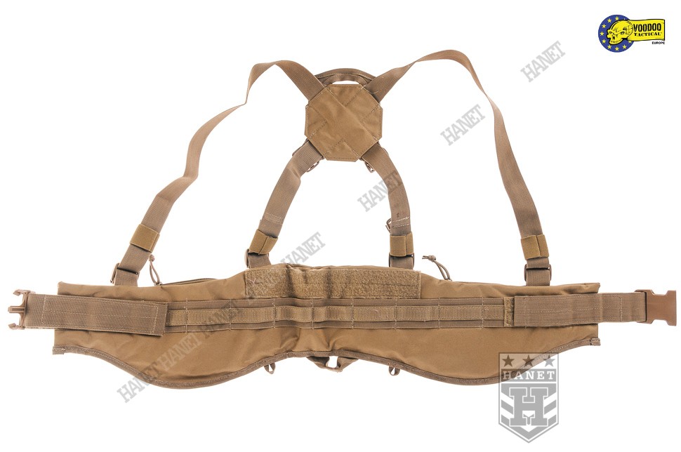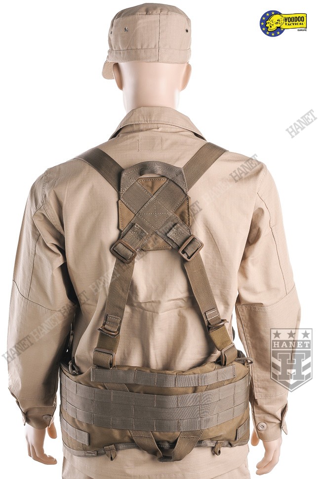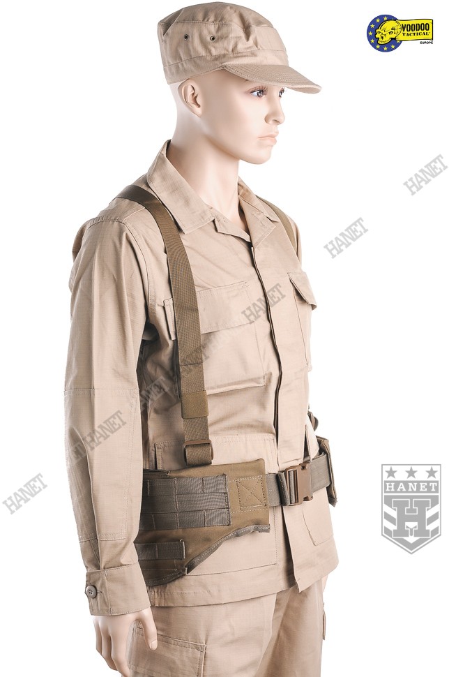 Nowoczesne paso-szelki taktyczne, przystosowane do przenoszenia ciężkiego oporządzenia. Kompatybilne z wyposażeniem modularnym w popularnym standardzie MOLLE 25mm (PALS). Doskonałe do mocowania ładownic, kieszeni, zasobników, kabur oraz innego sprzętu. Nowatorskie rozwiązania zapewniają wysoki komfort noszenia podczas długich akcji, nawet mocno obciążonego pasa. Mocowanie oporządzenia w okolicach talii (środek ciężkości ciała) sprzyja szybkiemu poruszaniu. Oporządzenie znajduje się w zasięgu rąk, co ułatwia dostęp do sprzętu. Uszyty z wytrzymałej i jednocześnie lekkiej Cordury 800D. Anatomiczna budowa gwarantuje dobre rozłożenie ciężaru, pas opiera się na biodrach. Wypełnienie z miękkiej pianki dla wygody. Zdejmowane szelki rozkładają część ciężaru na barkach i plecach, dodatkowo stabilizują pas podczas biegu i czołgania. Szelki wykonane z solidnej taśmy nylonowej 35mm. Wyposażone z pełną regulację długości. Szelki skrzyżne (typu X shape) zapewniają dobrą stabilność. Ruchomy element łącznikowy dla idealnego dopasowania. Na panelu łącznikowym wszyto uchwyt ewakuacyjny, do ewentualnego wyciągania rannego z rejonu zagrożenia. Dwie sprzączki oraz D-ringi umożliwiają mocowanie dodatkowego zasobnika na plecach. Gumki zabezpieczają wolne końce szelek, skracają nadmiar taśmy. Taśmy systemu modularnego zostały wszyte jedna przy drugiej, co daję większą dowolność w mocowaniu wyposażenia. Możliwość mocowania manierek i innego oporządzenia w starym standardzie modularnym. Dwie ukryte kieszenie wewnątrz pasa, doskonałe na drobiazgi. Kieszenie zamykane na ekspresy z linkami ułatwiającymi ich obsługę. Konstrukcja zamków wykorzystuje listwy uszczelniające dla zwiększenia wodoodporności. Pas od wewnątrz posiada system rzepów do zapięcia na zwykłym pasie. Z boku znajdują się klamry do mocowania kabur i paneli udowych. Klamry wykonane z metalu, ukryte wewnątrz pasa w specjalnej kieszonce na rzep. Uszy do podczepiania podręcznych przedmiotów, rozlokowane w tylnej części pasa. System regulacji obwodu, taśma 50 mm z trwałej plecionki nylonowej. Rzepy zabezpieczające luźne końce taśm regulujących. Pas zapinany na nowoczesną klamrę z ABSu. Klamra w systemie QR (Quick Release) umożliwia szybkie zrzucenie pasa w wymagającej tego sytuacji. Mocne szwy, obszycia z lamówki i grube, nylonowe nici gwarantują wytrzymałość.