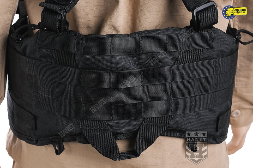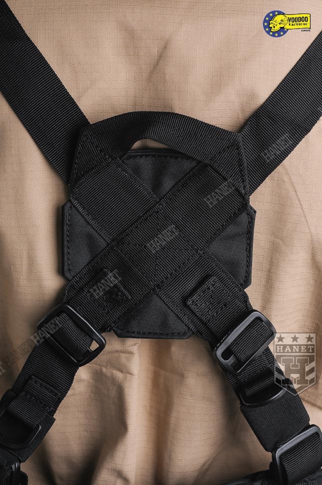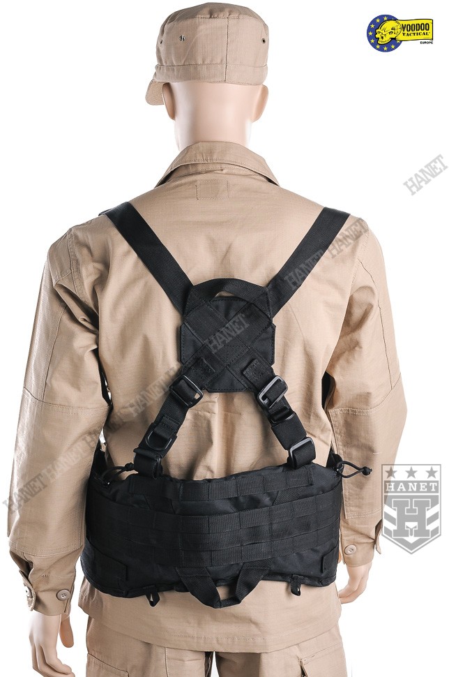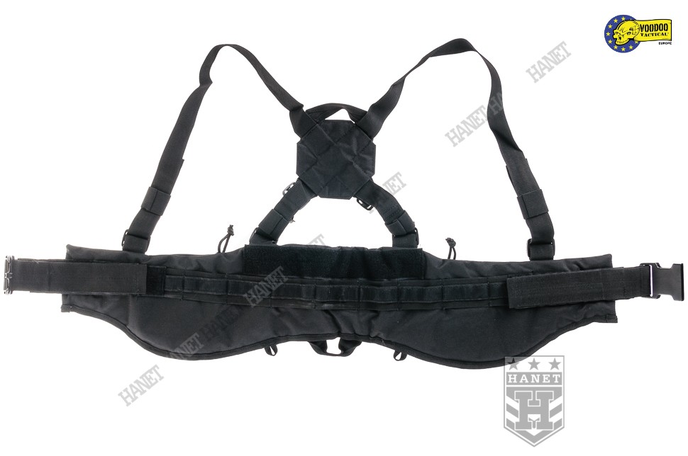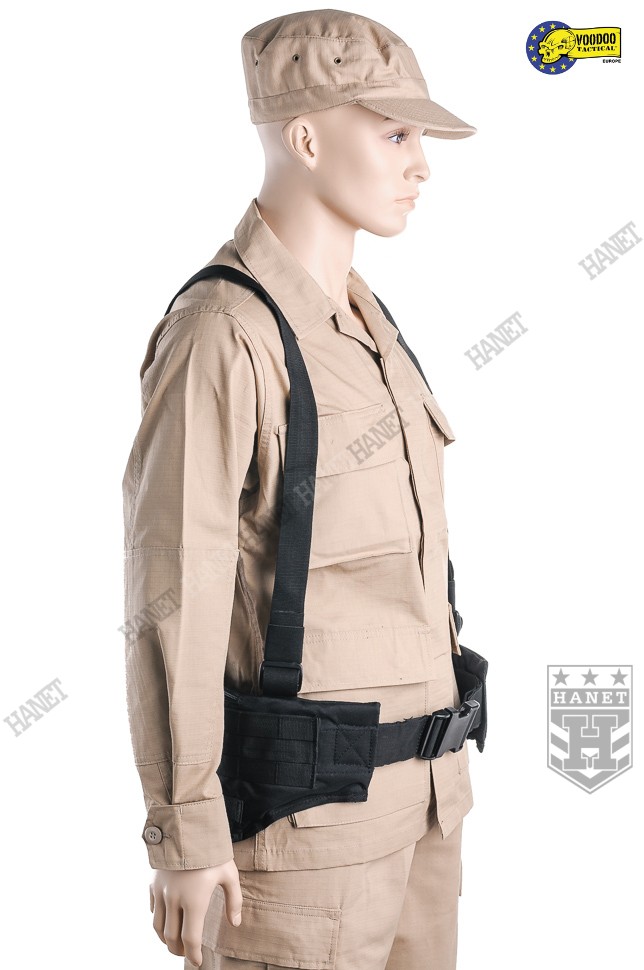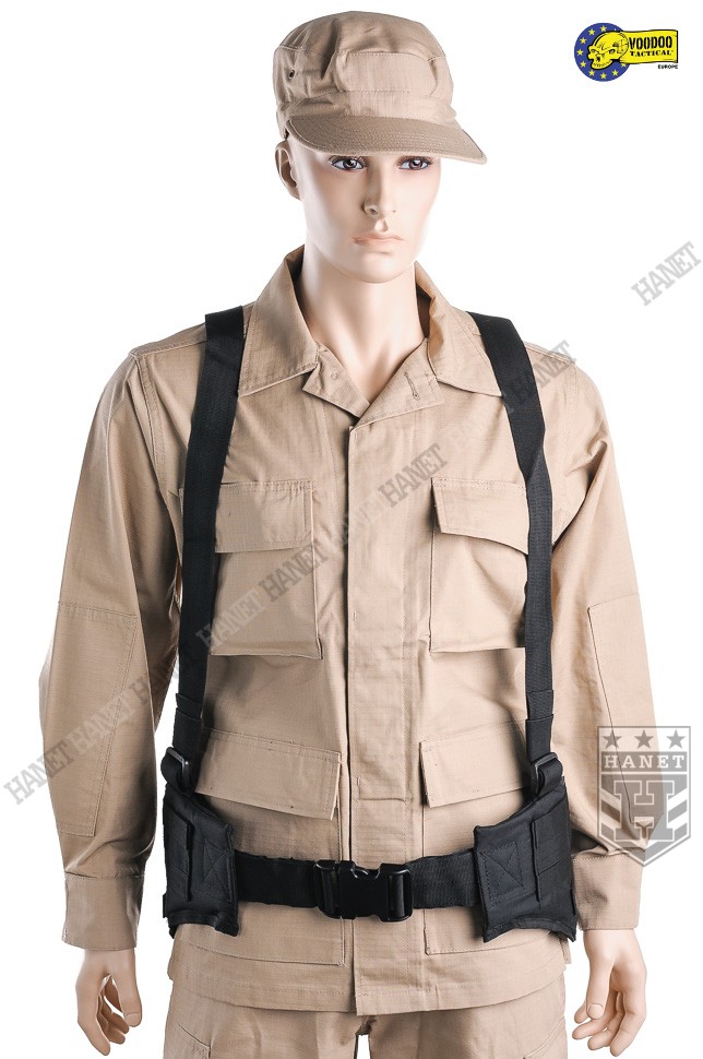 Nowoczesne paso-szelki taktyczne, przystosowane do przenoszenia ciężkiego oporządzenia. Kompatybilne z wyposażeniem modularnym w popularnym standardzie MOLLE 25mm (PALS). Doskonałe do mocowania ładownic, kieszeni, zasobników, kabur oraz innego sprzętu. Nowatorskie rozwiązania zapewniają wysoki komfort noszenia podczas długich akcji, nawet mocno obciążonego pasa. Mocowanie oporządzenia w okolicach talii (środek ciężkości ciała) sprzyja szybkiemu poruszaniu. Oporządzenie znajduje się w zasięgu rąk, co ułatwia dostęp do sprzętu. Uszyty z wytrzymałej i jednocześnie lekkiej Cordury 800D. Anatomiczna budowa gwarantuje dobre rozłożenie ciężaru, pas opiera się na biodrach. Wypełnienie z miękkiej pianki dla wygody. Zdejmowane szelki rozkładają część ciężaru na barkach i plecach, dodatkowo stabilizują pas podczas biegu i czołgania. Szelki wykonane z solidnej taśmy nylonowej 35mm. Wyposażone z pełną regulację długości. Szelki skrzyżne (typu X shape) zapewniają dobrą stabilność. Ruchomy element łącznikowy dla idealnego dopasowania. Na panelu łącznikowym wszyto uchwyt ewakuacyjny, do ewentualnego wyciągania rannego z rejonu zagrożenia. Dwie sprzączki oraz D-ringi umożliwiają mocowanie dodatkowego zasobnika na plecach. Gumki zabezpieczają wolne końce szelek, skracają nadmiar taśmy. Taśmy systemu modularnego zostały wszyte jedna przy drugiej, co daję większą dowolność w mocowaniu wyposażenia. Możliwość mocowania manierek i innego oporządzenia w starym standardzie modularnym. Dwie ukryte kieszenie wewnątrz pasa, doskonałe na drobiazgi. Kieszenie zamykane na ekspresy z linkami ułatwiającymi ich obsługę. Konstrukcja zamków wykorzystuje listwy uszczelniające dla zwiększenia wodoodporności. Pas od wewnątrz posiada system rzepów do zapięcia na zwykłym pasie. Z boku znajdują się klamry do mocowania kabur i paneli udowych. Klamry wykonane z metalu, ukryte wewnątrz pasa w specjalnej kieszonce na rzep. Uszy do podczepiania podręcznych przedmiotów, rozlokowane w tylnej części pasa. System regulacji obwodu, taśma 50 mm z trwałej plecionki nylonowej. Rzepy zabezpieczające luźne końce taśm regulujących. Pas zapinany na nowoczesną klamrę z ABSu. Klamra w systemie QR (Quick Release) umożliwia szybkie zrzucenie pasa w wymagającej tego sytuacji. Mocne szwy, obszycia z lamówki i grube, nylonowe nici gwarantują wytrzymałość.