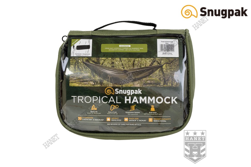 Hamak dzięki swoim dużym gabarytom (275 x 140 cm) zapewnia wygodną pozycję i ochronę przed wiatrem. Całe ciało zatapia się w hamaku, co zabezpiecza również przed przypadkowym wypadnięciem. Tropical Hammock posiada solidny i wygodny system nośny oraz jest łatwy w zawieszaniu. Kieszonka boczna pełni funkcję pokrowca na mokry hamak lub miejsca na telefon, latarkę i nóż. Główny pokrowiec ochronny zamykany na zamek, mieści hamak i zawiesie. Klapa pokrowca wykonana z oddychającej siatki, zabezpiecza hamak przed pleśnią i umożliwia jego wyschnięcie w transporcie.